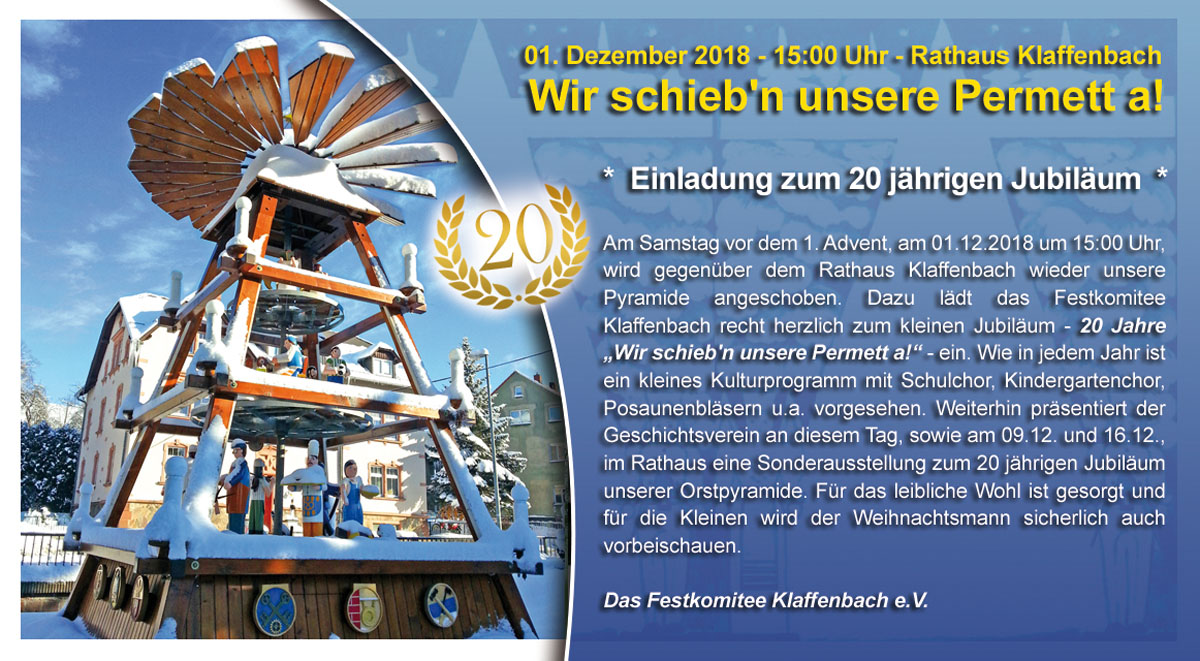 Am Samstag vor dem 1. Advent, am 01.12.2018 um 15:00 Uhr, wird gegenüber dem Rathaus Klaffenbach wieder unsere Pyramide angeschoben. Dazu lädt das Festkomitee Klaffenbach recht herzlich zum kleinen Jubiläum - 20 Jahre „Wir schieb'n unsere Permett a!“ - ein. Wie in jedem Jahr ist ein kleines Kulturprogramm mit Schulchor, Kindergartenchor, Posaunenbläsern u.a. vorgesehen. Für das leibliche Wohl ist gesorgt und für die Kleinen wird der Weihnachtsmann sicherlich auch vorbeischauen.