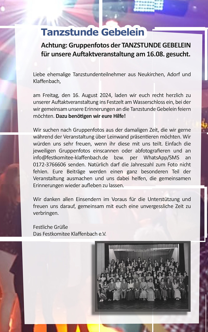 am Freitag, den 16. August 2024, laden wir euch recht herzlich zu unserer Auftaktveranstaltung ins Festzelt am Wasserschloss ein, bei der wir gemeinsam unsere Erinnerungen an die Tanzstunde Gebelein feiern möchten. Dazu benötigen wir eure Hilfe!