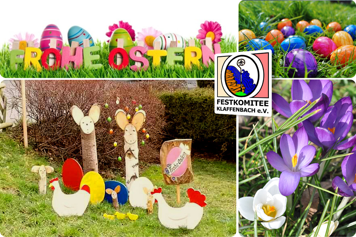Wir wünschen allen Klaffenbacherinnen und Klaffenbachern ein gesegnetes und frohes Osterfest und ein paar schöne Feiertage. Nach den verregneten letzten Tagen dürfen wir uns wohl auf ein überwiegend sonniges Osterwochenende freuen. Na da kommt doch Freude auf bei Groß und Klein. Und nicht vergessen, von Samstag auf Sonntag werden auch die Uhren wieder eine Stunde vorgestellt.