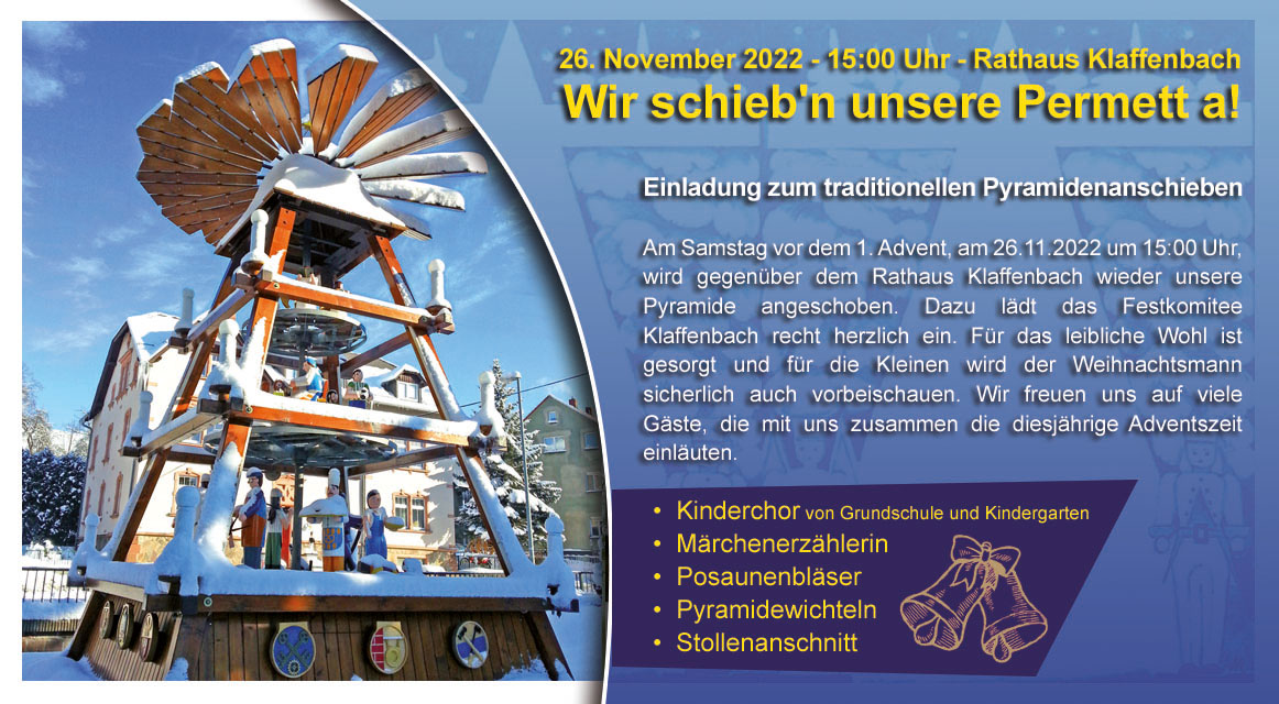 Am Samstag vor dem 1. Advent, am 01.12.2018 um 15:00 Uhr, wird gegenüber dem Rathaus Klaffenbach wieder unsere Pyramide angeschoben. Dazu lädt das Festkomitee Klaffenbach recht herzlich zum kleinen Jubiläum - 20 Jahre „Wir schieb'n unsere Permett a!“ - ein. Wie in jedem Jahr ist ein kleines Kulturprogramm mit Schulchor, Kindergartenchor, Posaunenbläsern u.a. vorgesehen. Für das leibliche Wohl ist gesorgt und für die Kleinen wird der Weihnachtsmann sicherlich auch vorbeischauen.