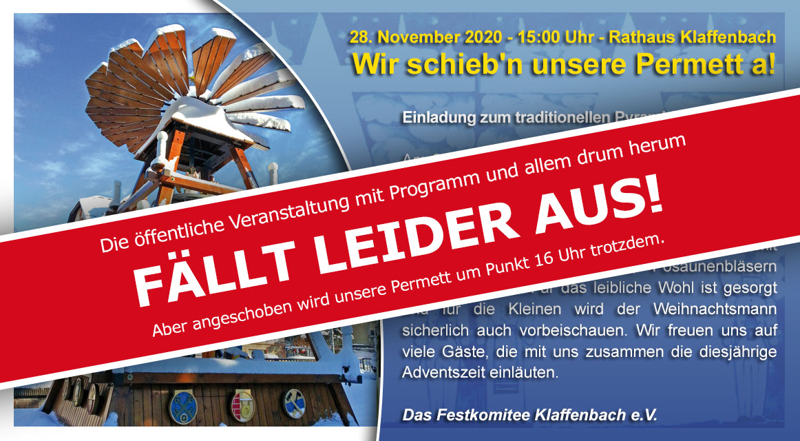 Am Samstag vor dem 1. Advent, am 01.12.2018 um 15:00 Uhr, wird gegenüber dem Rathaus Klaffenbach wieder unsere Pyramide angeschoben. Dazu lädt das Festkomitee Klaffenbach recht herzlich zum kleinen Jubiläum - 20 Jahre „Wir schieb'n unsere Permett a!“ - ein. Wie in jedem Jahr ist ein kleines Kulturprogramm mit Schulchor, Kindergartenchor, Posaunenbläsern u.a. vorgesehen. Für das leibliche Wohl ist gesorgt und für die Kleinen wird der Weihnachtsmann sicherlich auch vorbeischauen.