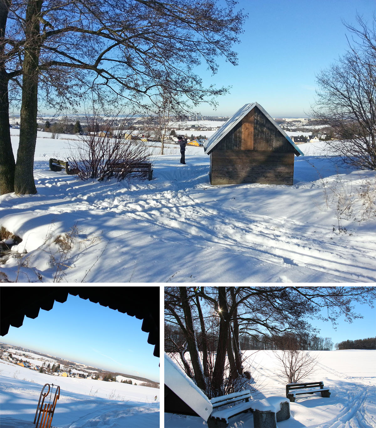 Die Schutzhütte auf dem Weg zum Eisenweg dient auch im Winter den Wandersleuten als Rast und bietet zugleich einen herrlichen Blick übers Tal. Traumhaft bei diesem Wetter.