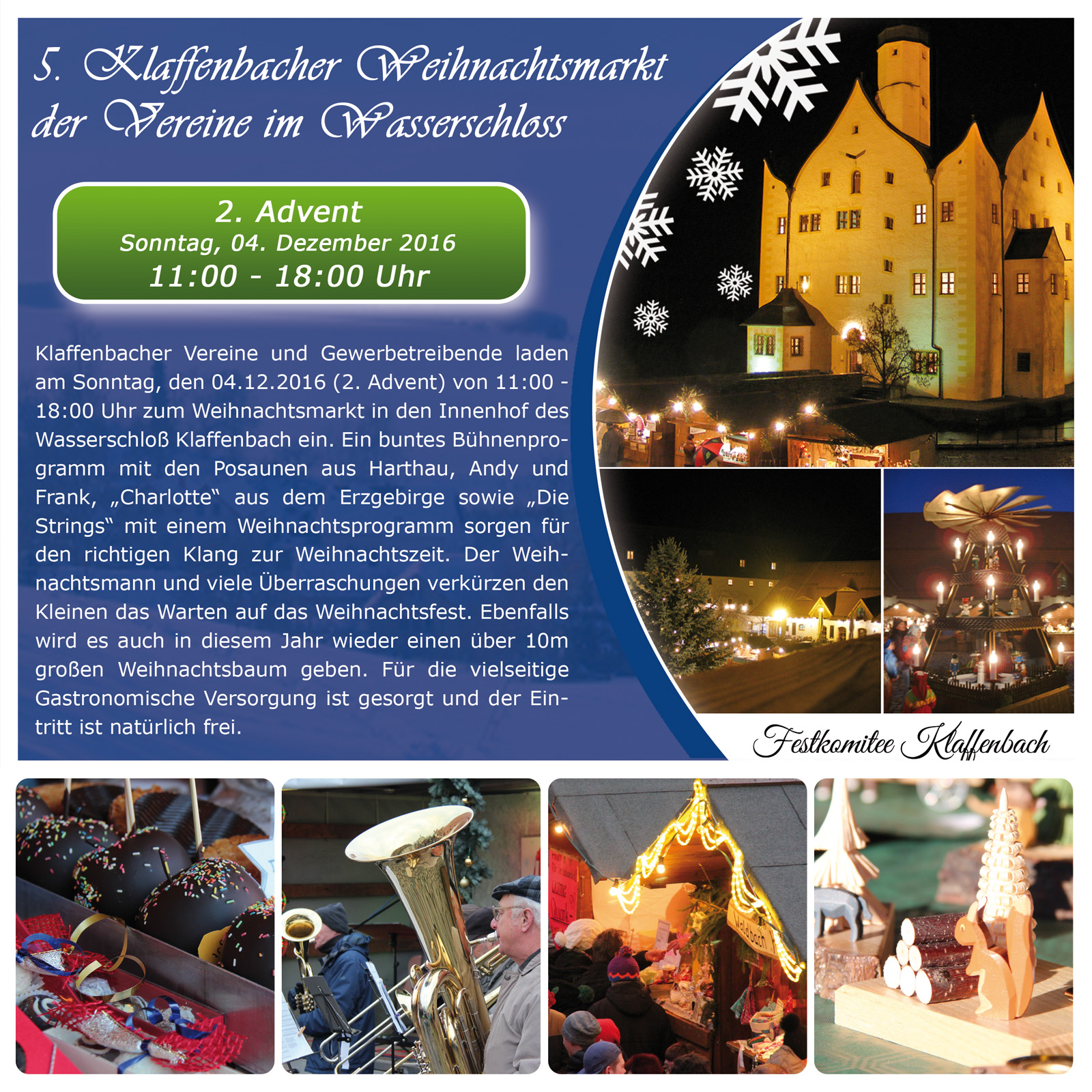 Klaffenbacher Vereine und Gewerbetreibende laden am Sonntag, den 10.12.2017 (2. Advent) von 11:00 - 18:00 Uhr zum Weihnachtsmarkt in den Innenhof des Wasserschloß Klaffenbach ein. Ein buntes Bühnenprogramm mit den Lichtensteiner Turmbläsern, der Kreuzkirche Klaffenbach, Andy & Frank und der Band "Die Strings" mit einem Weihnachtsprogramm sorgen für den richtigen Klang zur Weihnachtszeit. Der Weihnachtsmann und viele Überraschungen verkürzen den Kleinen das Warten auf das Weihnachtsfest. Ebenfalls wird es auch in diesem Jahr wieder einen über 10m großen Weihnachtsbaum geben. Für die vielseitige Gastronomische Versorgung ist gesorgt und der Eintritt ist natürlich frei.