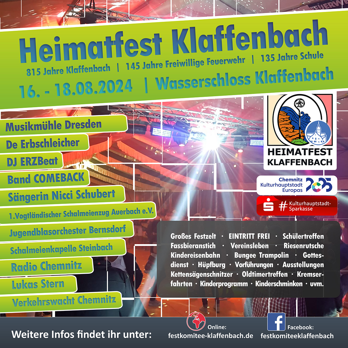 Dieses Jahr feiern wir gemeinsam mit euch 815 Jahre Klaffenbach, 145 Jahre Freiwillige Feuerwehr und 135 Jahre Schule. Natürlich wieder mit Schülertreffen, Live Musik, Schaustellern, Vereinsvorführungen und -ausstellungen, Schalmeien, Kremserfahrten, Kinderprogramm sowie lecker Speis und Trank.