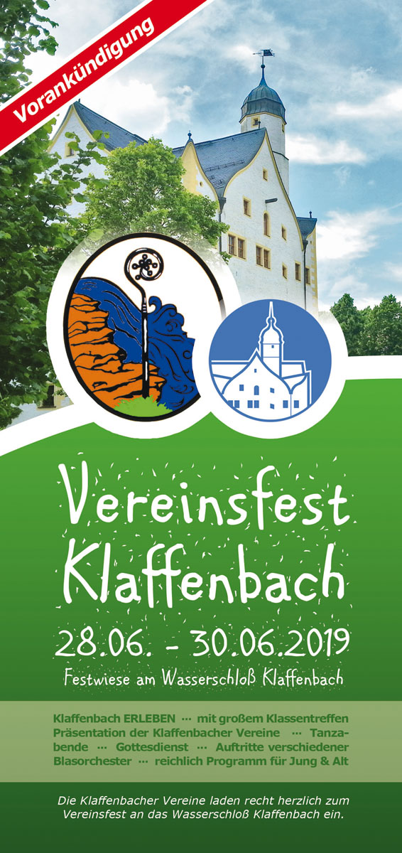 Fest im Plan steht vor allem die Planung des nächsten Klaffenbacher Vereinsfestes. Vom 28.06. – 30.06.2019 heißt es dann wieder „Klaffenbach erleben“ auf der Festwiese am Wasserschloß. Laut vorläufigem Ablaufplan gibt es am Freitag wieder ein großes Klassentreffen, am Samstag präsentieren sich die Klaffenbacher Vereine mit anschließendem Tanzabend und der Sonntag beginnt mit einem Gottesdienst der Kreuzkirche Klaffenbach gefolgt von Auftritten verschiedener Blasorchester und sicherlich reichlich Programm für Jung und Alt. Nähere und genauere Informationen gibt es im Laufe der nächsten Monate.