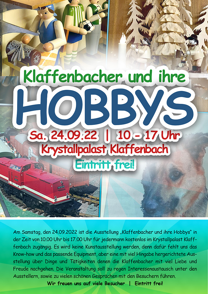 Am Samstag, den 20.09.2025 heißt es wieder Willkommen zur Ausstellung „Klaffenbacher und ihre Hobbys“ ab 10.00 Uhr im Krystallpalast Klafffenbach. Die Veranstaltung soll zu regen Interessenaustausch unter den Ausstellern, sowie zu vielen schönen Gesprächen mit den Besuchern führen. Wer sein Hobby ausstellen möchte, kann sich ab sofort unter den Tel. Nr. 015756628615 und der Nr. 01723606571 anmelden. Wir freuen uns auf eure Anrufe!