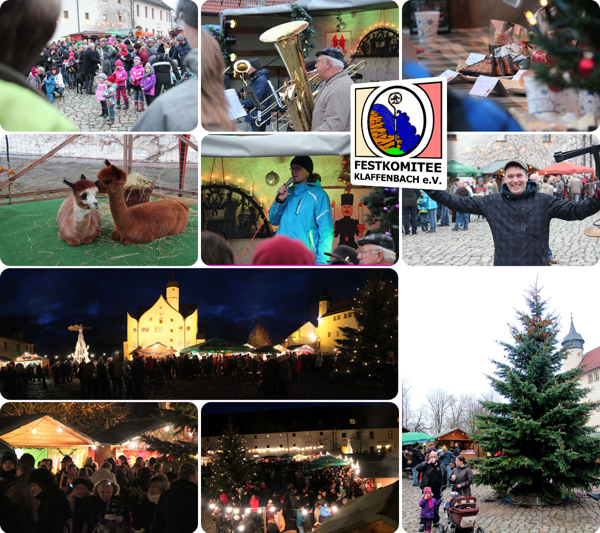 Knapp 8 Tage nach dem Pyramideanschieben findet zum nun mehr vierten Male der "Weihnachtsmarkt der Vereine" im Wasserschloß Klaffenbach statt. Auch dieses Jahr laden die Klaffenbacher Vereine und Gewerbetreibende Sie, liebe Besucher, wieder recht herzlich dazu ein, gemeinsam mit uns einen wundervollen 2. Advent im Innenhof des Wasserschloßes zu verbringen. Am Sonntag, den 06.12.2015 findet von 11:00 - 18:00 Uhr ein buntes Bühnenprogramm mit den Posaunen aus Harthau, Andy und Frank sowie der Volkskunstgruppe "Grenzenlos" - mit erzgebirgischen Weihnachtsliedern - statt. Der Weihnachtsmann und viele Überraschungen verkürzen den Kleinen das warten auf das Weihnachtsfest. Ebenfalls wird es auch in diesem Jahr wieder einen über 10m großen Weihnachtsbaum geben. Für die vielseitige gastronomische Versorgung ist gesorgt und der Eintritt ist natürlich frei. Über zahlreiche Besucher würden sich die Klaffenbacher sehr freuen.