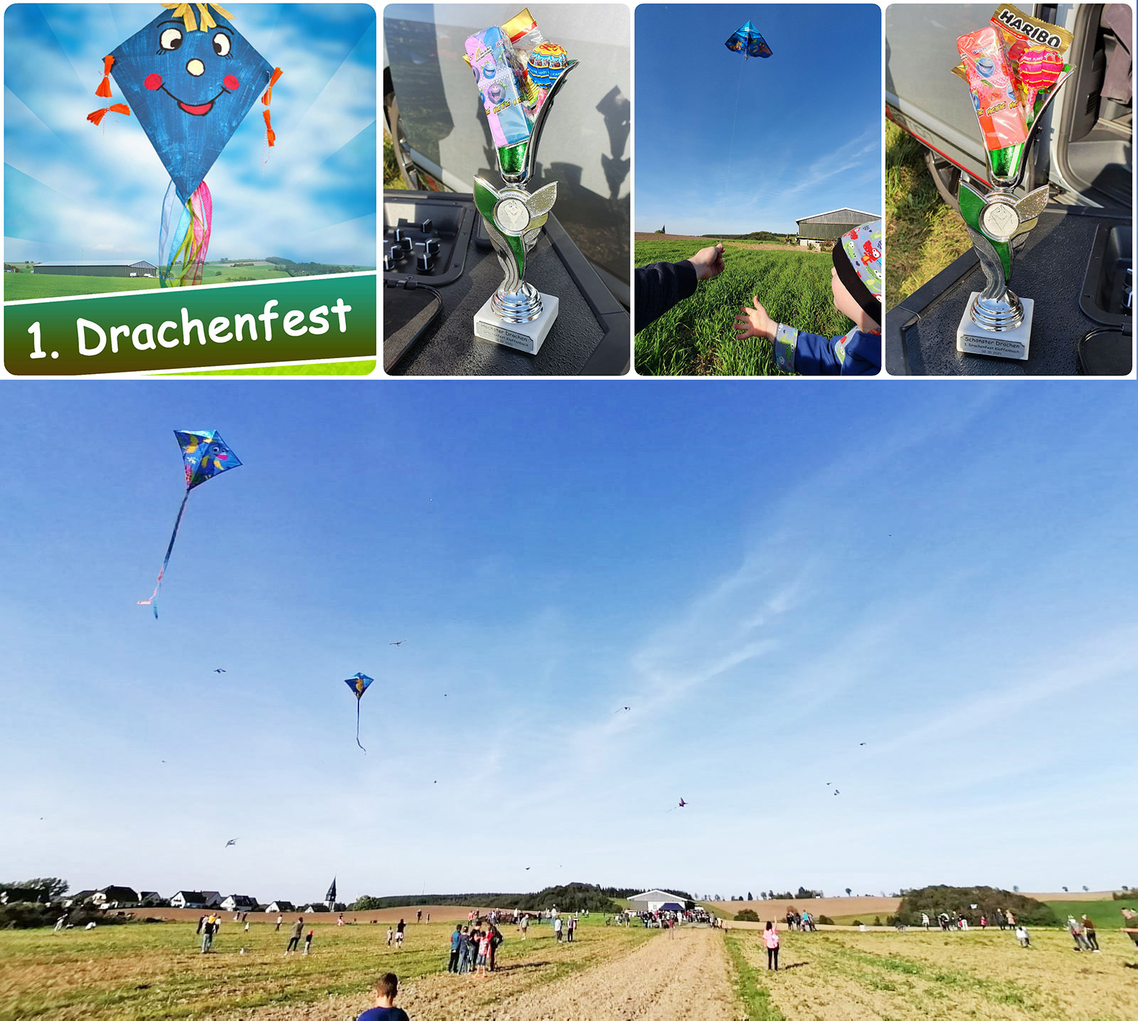 08.10.2022 | 14:00 Uhr | Schönstes Herbstwetter bescherrte uns letzten Samstag das 2. Klaffenbacher Drachenfest, trotz Regendusche am späten Nachmittag. Vielen Dank allen Gästen und Helfern für diesen wunderbaren Tag und noch einmal herzlichen Glückwunsch an die Preisträger Kalle für den originellsten Drachen und Fibi* für den am höchstfliegensten Drachen. Übrigens wurde gestern auch der Drachen von Herrn Thomas W. wiedergefunden, welcher bei über 300m Höhe allein in die weite Ferne weiterflog. Wir sehen uns nächstes Jahr zum 3. Drachenfest wieder. * Wahrscheinlich ist dieser Name falsch geschrieben und darf gern korrigiert werden :-D Wir bitte um Entschuldigung.