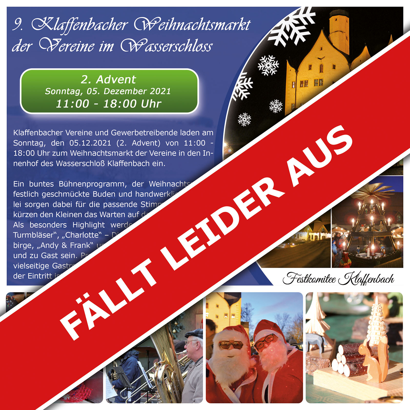 Klaffenbacher Vereine und Gewerbetreibende laden am Sonntag, den 04.12.2022 (2. Advent) von 11:00 - 18:00 Uhr zum Weihnachtsmarkt der Vereine in den Innenhof des Wasserschloß Klaffenbach ein. Ein buntes Bühnenprogramm, der Weihnachtsmann, festlich geschmückte Buden und handwerkliches Allerlei sorgen dabei für die passende Stimmung und verkürzen den Kleinen das Warten auf das Weihnachtsfest. Als besonders Highlight werden die "Lichtensteiner Turmbläser", "Charlotte" - Die Stimme aus dem Erzgebirge, "Andy & Frank" und die "Bergkapelle Thum" bei uns zu Gast sein. Programmbeginn 13:30 Uhr. Für die vielseitige Gastronomische Versorgung ist gesorgt und der Eintritt ist natürlich frei.