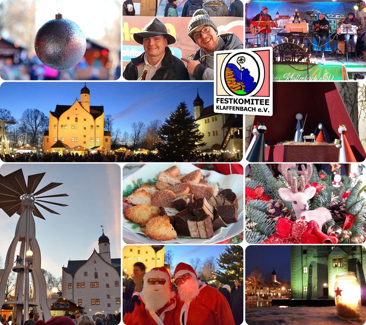 Klaffenbacher Vereine und Gewerbetreibende laden am Sonntag, den 10.12.2017 (2. Advent) von 11:00 - 18:00 Uhr zum Weihnachtsmarkt in den Innenhof des Wasserschloß Klaffenbach ein. Ein buntes Bühnenprogramm mit den Lichtensteiner Turmbläsern, der Kreuzkirche Klaffenbach, Andy & Frank und der Band "Die Strings" mit einem Weihnachtsprogramm sorgen für den richtigen Klang zur Weihnachtszeit. Der Weihnachtsmann und viele Überraschungen verkürzen den Kleinen das Warten auf das Weihnachtsfest. Ebenfalls wird es auch in diesem Jahr wieder einen über 10m großen Weihnachtsbaum geben. Für die vielseitige Gastronomische Versorgung ist gesorgt und der Eintritt ist natürlich frei.