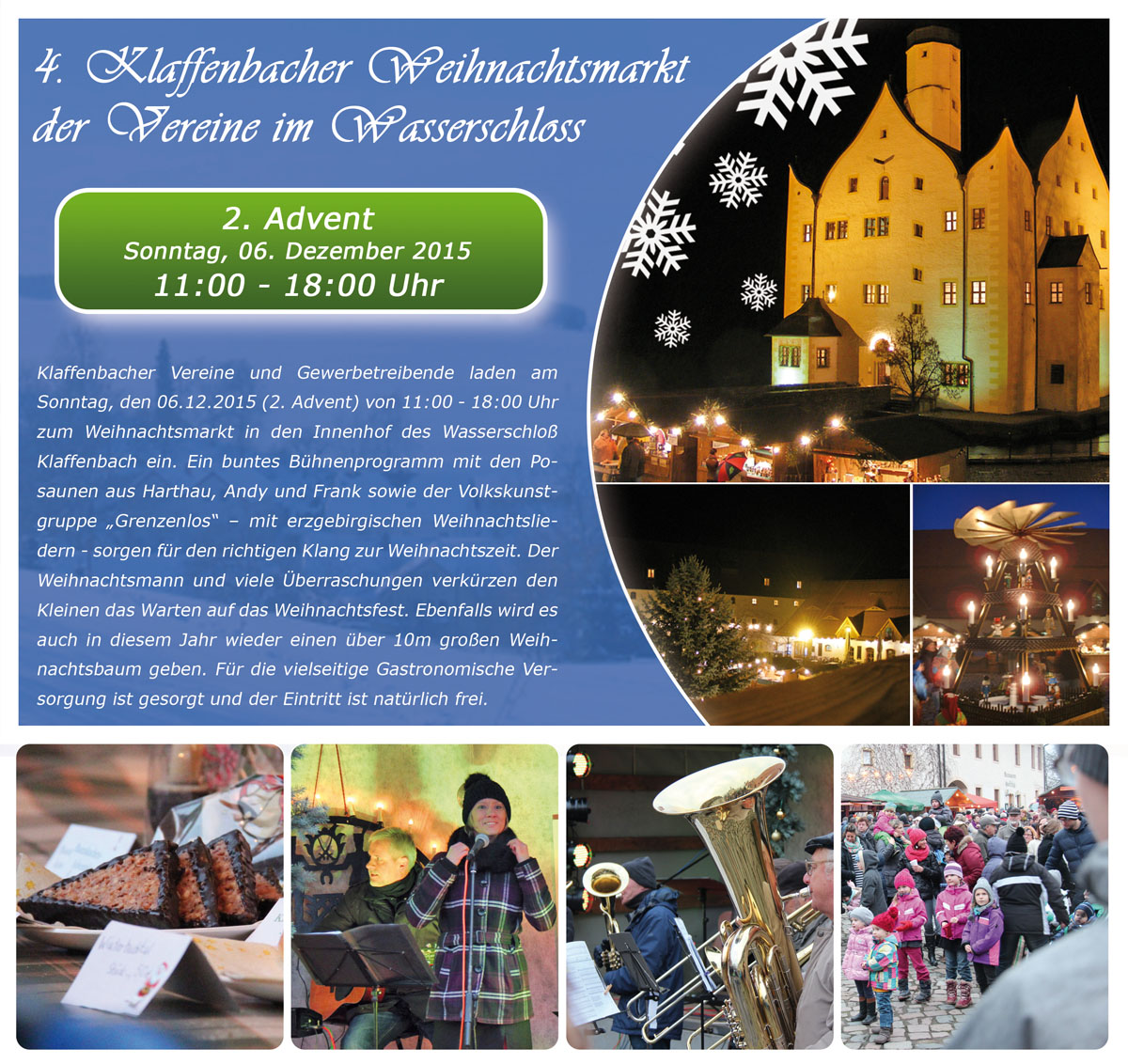Knapp 8 Tage nach dem Pyramideanschieben findet zum nun mehr vierten Male der "Weihnachtsmarkt der Vereine" im Wasserschloß Klaffenbach statt. Auch dieses Jahr laden die Klaffenbacher Vereine und Gewerbetreibende Sie, liebe Besucher, wieder recht herzlich dazu ein, gemeinsam mit uns einen wundervollen 2. Advent im Innenhof des Wasserschloßes zu verbringen. Am Sonntag, den 06.12.2015 findet von 11:00 - 18:00 Uhr ein buntes Bühnenprogramm mit den Posaunen aus Harthau, Andy und Frank sowie der Volkskunstgruppe "Grenzenlos" - mit erzgebirgischen Weihnachtsliedern - statt. Der Weihnachtsmann und viele Überraschungen verkürzen den Kleinen das warten auf das Weihnachtsfest. Ebenfalls wird es auch in diesem Jahr wieder einen über 10m großen Weihnachtsbaum geben. Für die vielseitige gastronomische Versorgung ist gesorgt und der Eintritt ist natürlich frei. Über zahlreiche Besucher würden sich die Klaffenbacher sehr freuen.