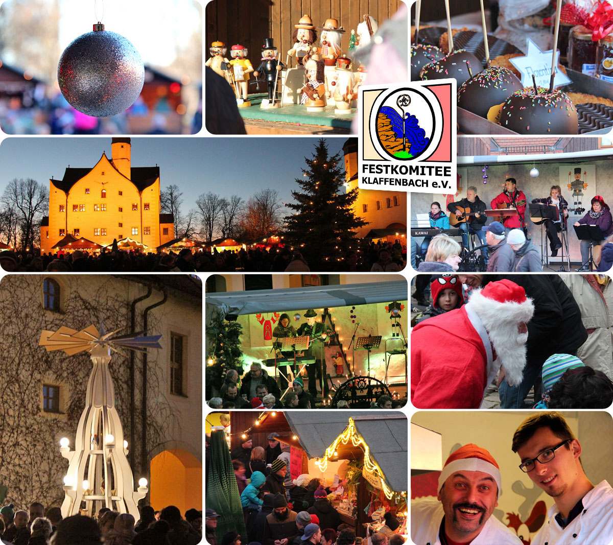 Knapp 8 Tage nach dem Pyramideanschieben findet zum nun mehr vierten Male der "Weihnachtsmarkt der Vereine" im Wasserschloß Klaffenbach statt. Auch dieses Jahr laden die Klaffenbacher Vereine und Gewerbetreibende Sie, liebe Besucher, wieder recht herzlich dazu ein, gemeinsam mit uns einen wundervollen 2. Advent im Innenhof des Wasserschloßes zu verbringen. Am Sonntag, den 06.12.2015 findet von 11:00 - 18:00 Uhr ein buntes Bühnenprogramm mit den Posaunen aus Harthau, Andy und Frank sowie der Volkskunstgruppe "Grenzenlos" - mit erzgebirgischen Weihnachtsliedern - statt. Der Weihnachtsmann und viele Überraschungen verkürzen den Kleinen das warten auf das Weihnachtsfest. Ebenfalls wird es auch in diesem Jahr wieder einen über 10m großen Weihnachtsbaum geben. Für die vielseitige gastronomische Versorgung ist gesorgt und der Eintritt ist natürlich frei. Über zahlreiche Besucher würden sich die Klaffenbacher sehr freuen.