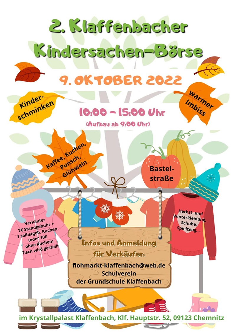 Die 5. Klaffenbacher Kindersachen-Börse mit einer großen Auswahl an Kindersachen für Groß und Klein, Spielsachen, Büchern und vieles mehr. Wir haben auch ein kleines Imbissangebot sowie eine Bastelstraße und Glitzertattoos vorbereitet und freuen uns auf viele Besucher.