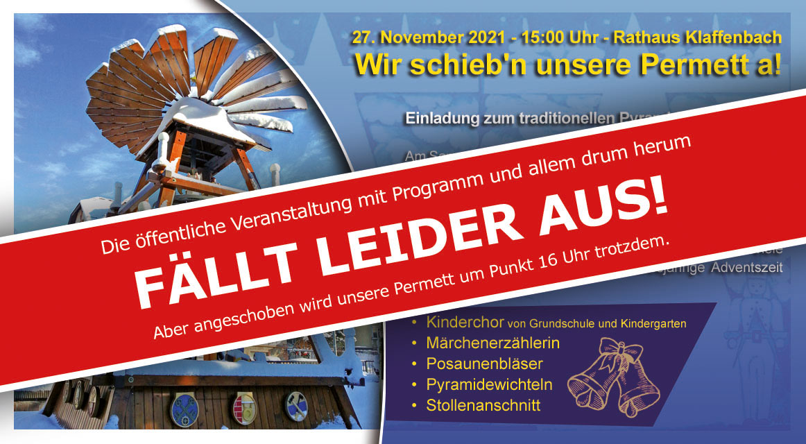 Am Samstag vor dem 1. Advent, am 01.12.2018 um 15:00 Uhr, wird gegenüber dem Rathaus Klaffenbach wieder unsere Pyramide angeschoben. Dazu lädt das Festkomitee Klaffenbach recht herzlich zum kleinen Jubiläum - 20 Jahre „Wir schieb'n unsere Permett a!“ - ein. Wie in jedem Jahr ist ein kleines Kulturprogramm mit Schulchor, Kindergartenchor, Posaunenbläsern u.a. vorgesehen. Für das leibliche Wohl ist gesorgt und für die Kleinen wird der Weihnachtsmann sicherlich auch vorbeischauen.