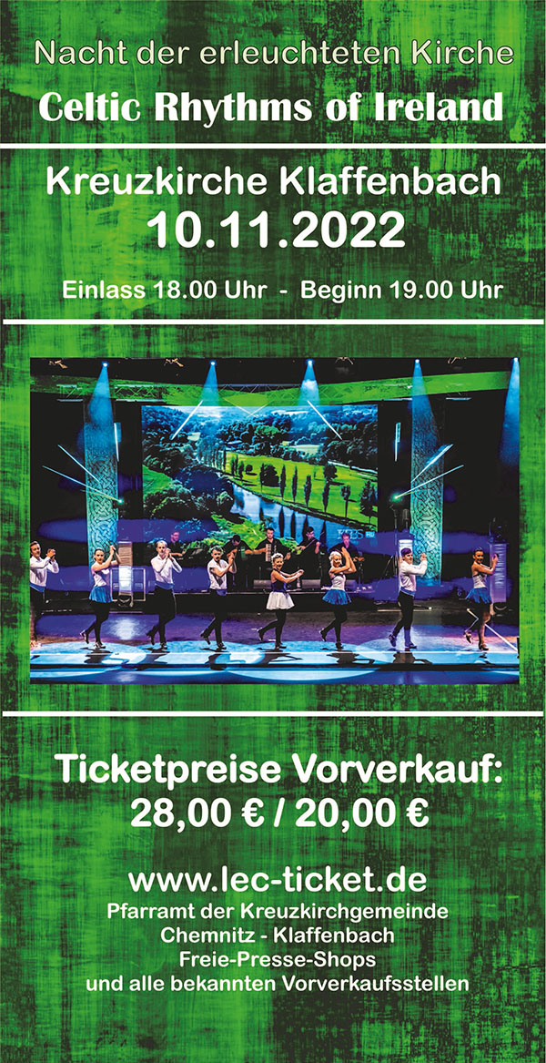 Nacht der erleuchteten Kirche - IRISH DANCE and LIVE MUSIC 12.11.2025 | 18:30 Uhr | Kreuzkirche Klaffenbach | Eine farbig beleuchtete Kirche, die schon von Weitem zu sehen ist - eine Lasershow, bewegte Bilder und eine farblich passend arrangierte Innenraumbeleuchtung der Kirche sowie Livemusik - das alles ist die Nacht der erleuchteten Kirche in Klaffenbach, zu der wir ganz herzlich einladen. In diesem Jahr freuen wir uns auf IRISH DANCE and LIVE MUSIC. Gemeinsam mit der "Laser Event Company" aus Eibenstock werden wir ein beeindruckendes Programm erleben. Karten können ab sofort u.a. im Pfarramt Klaffenbach erworben werden. Weitere Infos unter: http://kirche-klaffenbach.blogspot.de/