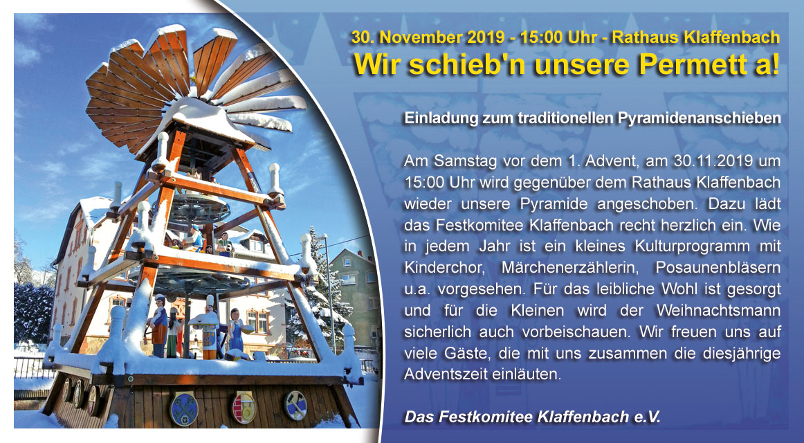 Am Samstag vor dem 1. Advent, am 01.12.2018 um 15:00 Uhr, wird gegenüber dem Rathaus Klaffenbach wieder unsere Pyramide angeschoben. Dazu lädt das Festkomitee Klaffenbach recht herzlich zum kleinen Jubiläum - 20 Jahre „Wir schieb'n unsere Permett a!“ - ein. Wie in jedem Jahr ist ein kleines Kulturprogramm mit Schulchor, Kindergartenchor, Posaunenbläsern u.a. vorgesehen. Für das leibliche Wohl ist gesorgt und für die Kleinen wird der Weihnachtsmann sicherlich auch vorbeischauen.
