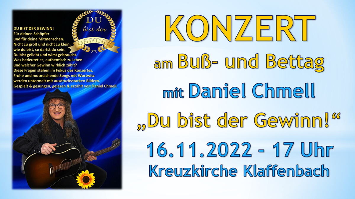 Konzert zum Buß- und Bettag mit Thomas Steinlein 20.11.2024 | 17:00 Uhr | Kreuzkirche Klaffenbach Weitere Infos unter: http://kirche-klaffenbach.blogspot.de/