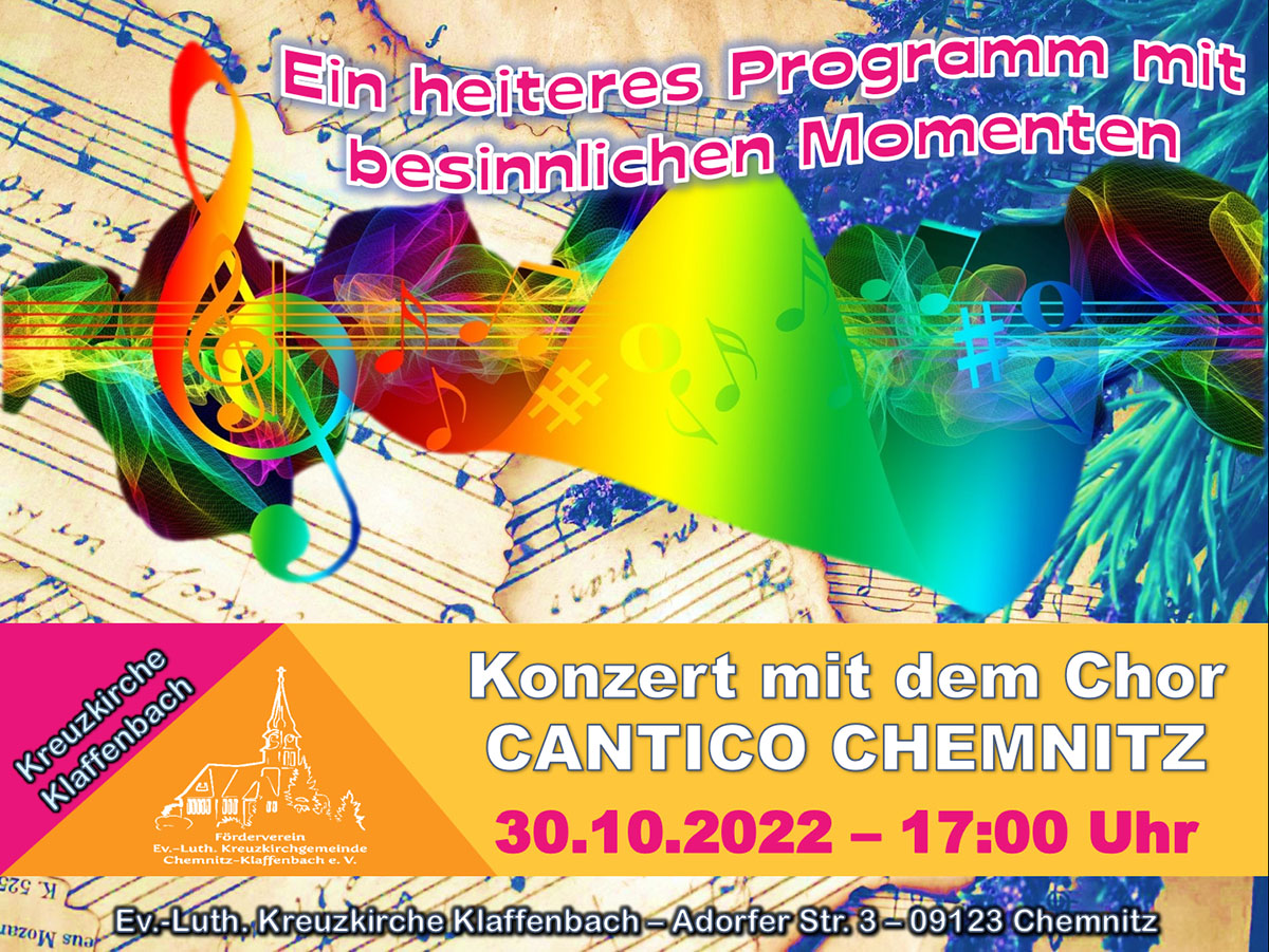 Nacht der erleuchteten Kirche - IRISH DANCE and LIVE MUSIC 12.11.2025 | 18:30 Uhr | Kreuzkirche Klaffenbach | Eine farbig beleuchtete Kirche, die schon von Weitem zu sehen ist - eine Lasershow, bewegte Bilder und eine farblich passend arrangierte Innenraumbeleuchtung der Kirche sowie Livemusik - das alles ist die Nacht der erleuchteten Kirche in Klaffenbach, zu der wir ganz herzlich einladen. In diesem Jahr freuen wir uns auf IRISH DANCE and LIVE MUSIC. Gemeinsam mit der "Laser Event Company" aus Eibenstock werden wir ein beeindruckendes Programm erleben. Karten können ab sofort u.a. im Pfarramt Klaffenbach erworben werden. Weitere Infos unter: http://kirche-klaffenbach.blogspot.de/