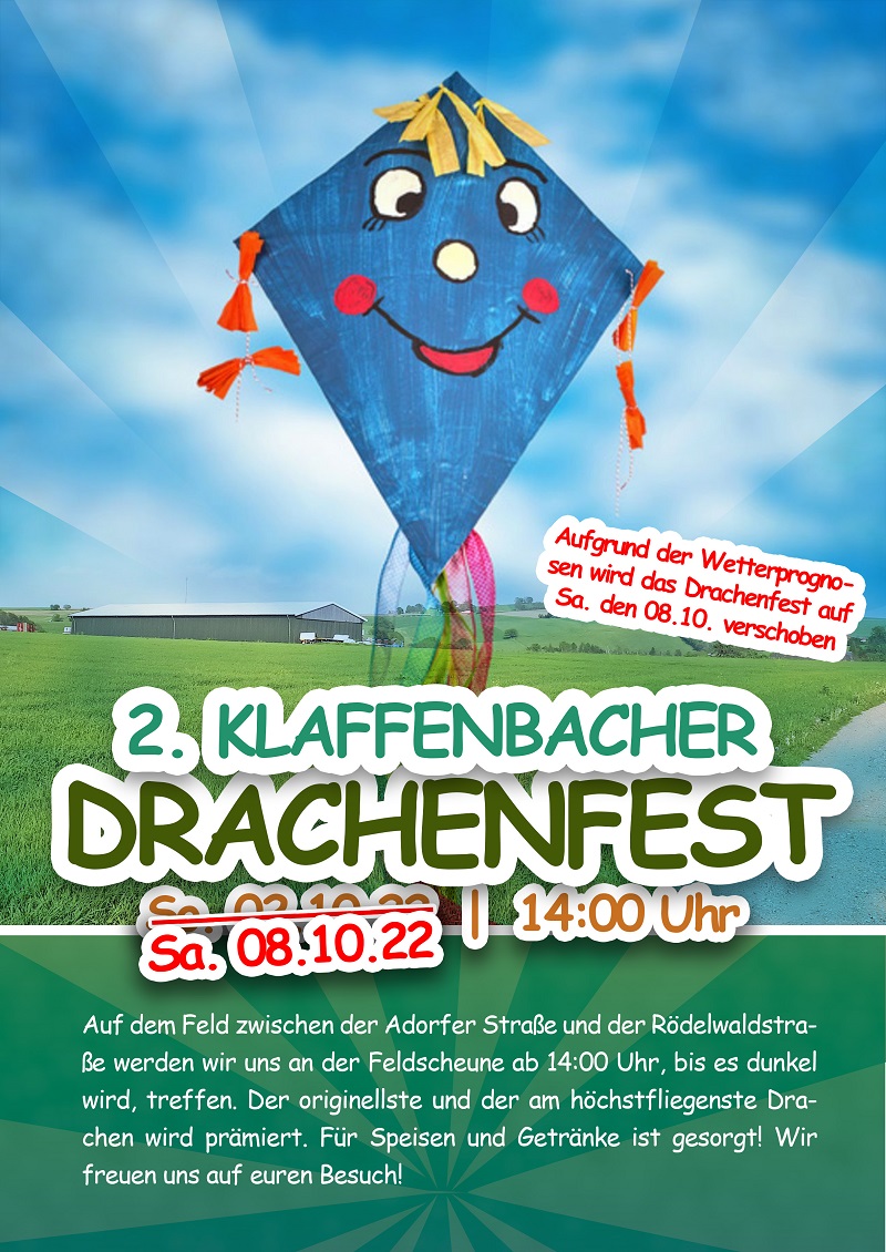 5. Klaffenbacher Drachenfest 04.10.2025 | 14:00 Uhr | Haupttermin ist Sonnabend, der 4. Oktober und bei schlechtem Wetter weichen wir auf den darauffolgenden Sonnabend, den 11. Oktober aus. Dazu lädt euch das Festkomitee Klaffenbach e.V. recht herzlich auf das Feld zwischen der Adorfer Straße und der Rödelwaldstraße ein. Der originellste und der am höchstfliegenste Drachen werden wieder prämiert. Für Speisen und Getränke ist gesorgt!