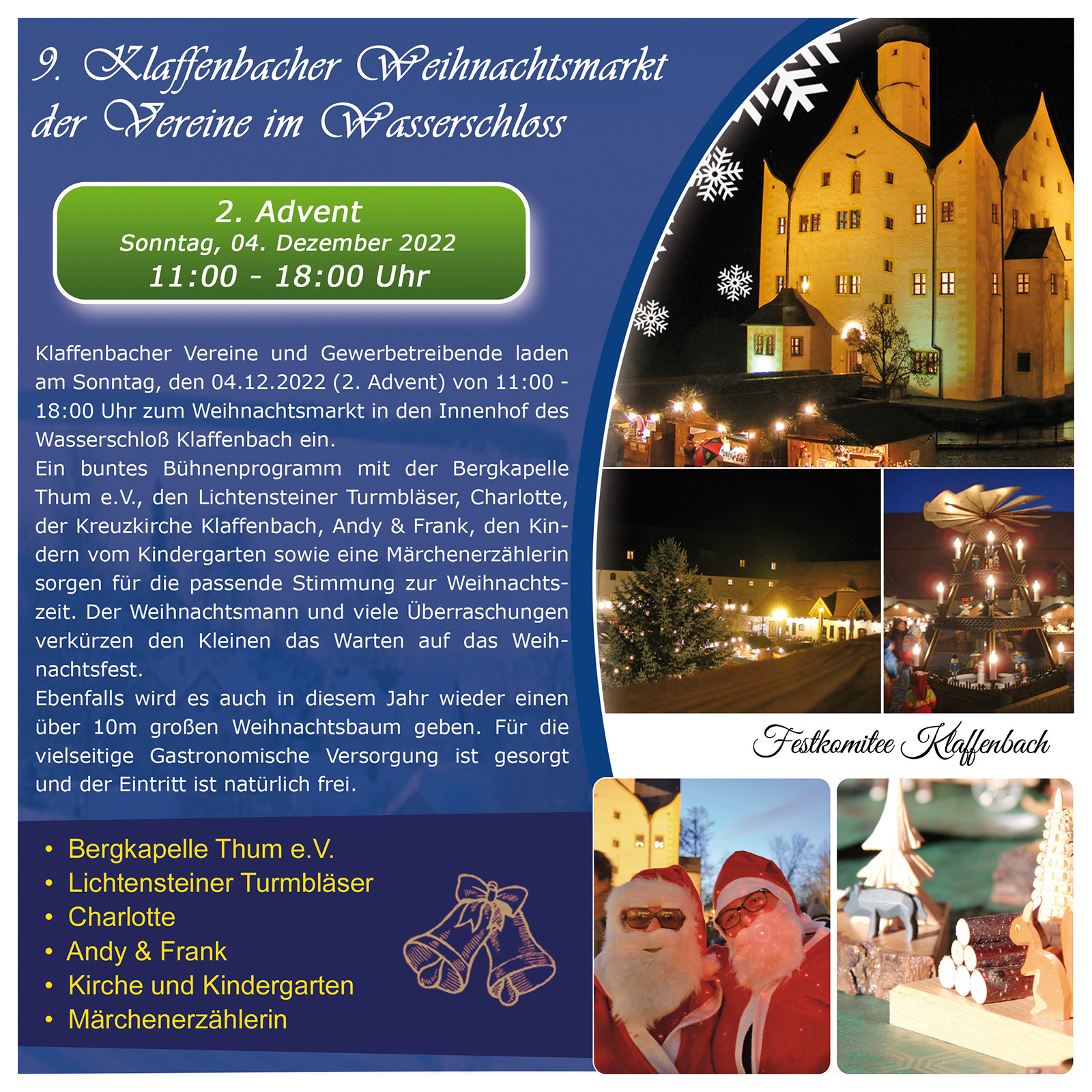 Klaffenbacher Vereine und Gewerbetreibende laden am Sonntag, den 09.12.2018 (2. Advent) von 11:00 - 18:00 Uhr zum Weihnachtsmarkt in den Innenhof des Wasserschloß Klaffenbach ein. Ein buntes Bühnenprogramm mit dem Harthauer Posaunenchor, der Kreuzkirche Klaffenbach, Andy & Frank und die Gelenauer Marionettenspiele sorgen für den richtigen Klang und die passende Stimmung zur Weihnachtszeit. Der Weihnachtsmann und viele Überraschungen verkürzen den Kleinen das Warten auf das Weihnachtsfest. Ebenfalls wird es auch in diesem Jahr wieder einen über 10m großen Weihnachtsbaum geben. Für die vielseitige Gastronomische Versorgung ist gesorgt und der Eintritt ist natürlich frei.
