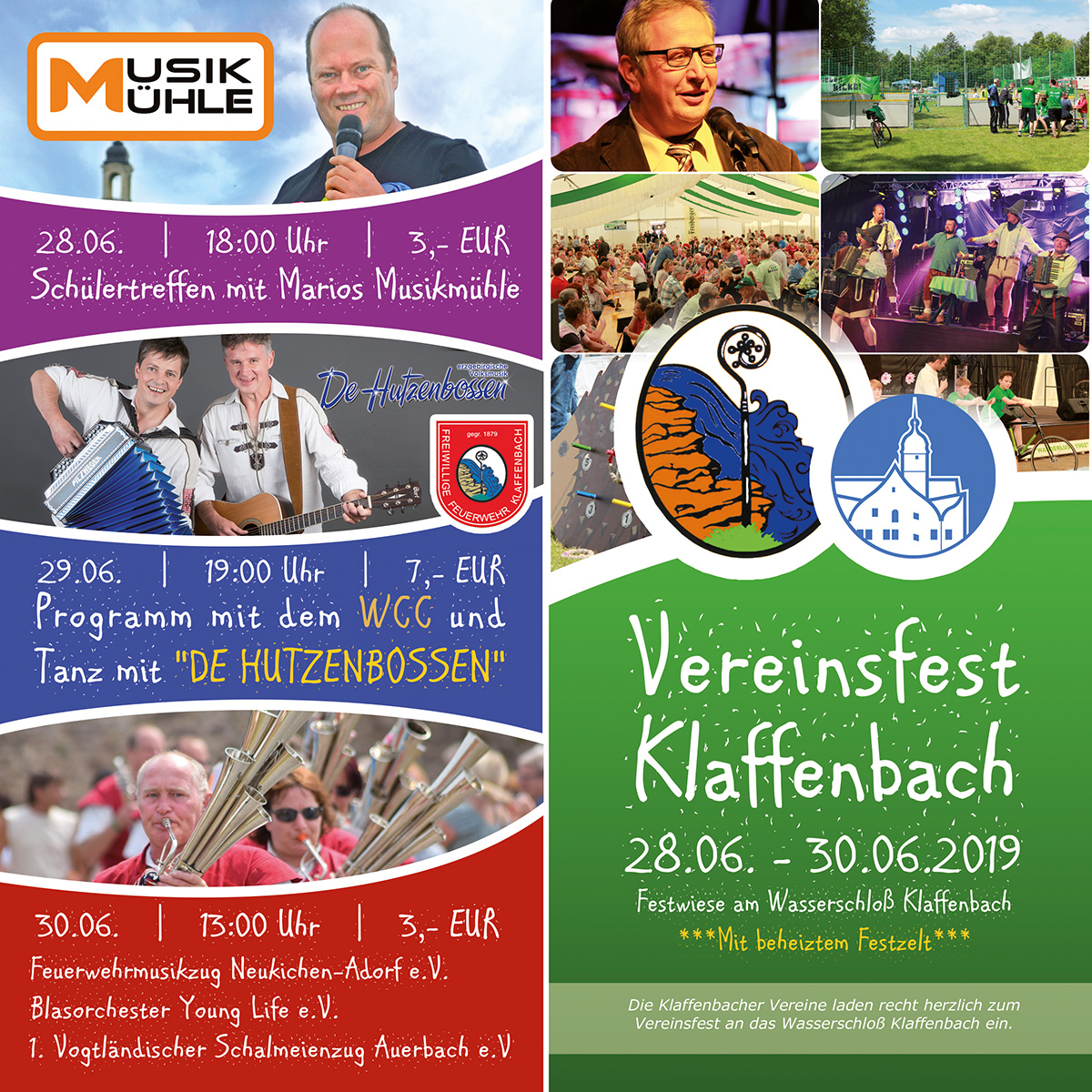 Fest im Plan steht vor allem die Planung des nächsten Klaffenbacher Vereinsfestes. Vom 28.06. – 30.06.2019 heißt es dann wieder „Klaffenbach erleben“ auf der Festwiese am Wasserschloß. Laut vorläufigem Ablaufplan gibt es am Freitag wieder ein großes Klassentreffen, am Samstag präsentieren sich die Klaffenbacher Vereine mit anschließendem Tanzabend und der Sonntag beginnt mit einem Gottesdienst der Kreuzkirche Klaffenbach gefolgt von Auftritten verschiedener Blasorchester und sicherlich reichlich Programm für Jung und Alt. Nähere und genauere Informationen gibt es im Laufe der nächsten Monate.