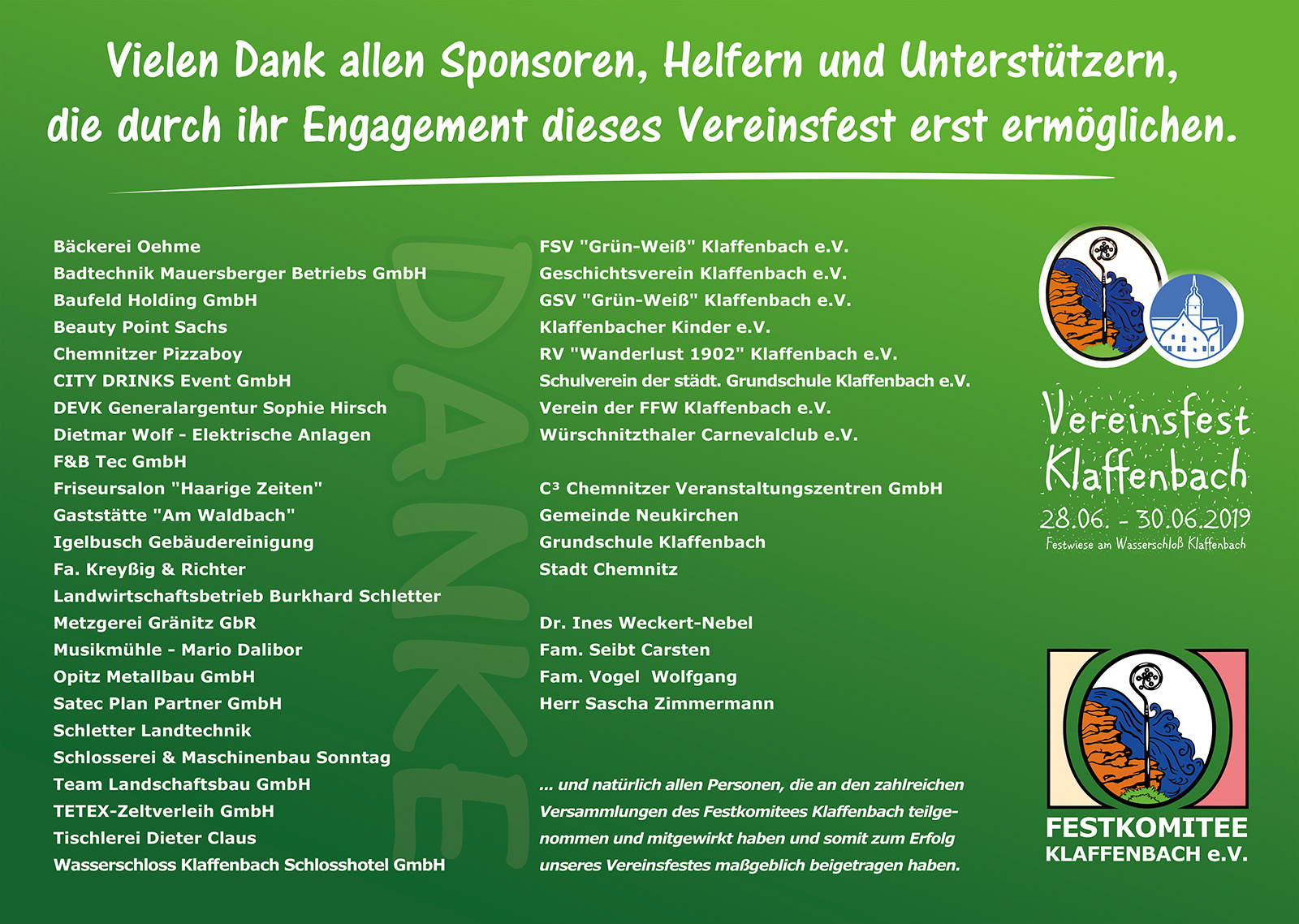 Fest im Plan steht vor allem die Planung des nächsten Klaffenbacher Vereinsfestes. Vom 28.06. – 30.06.2019 heißt es dann wieder „Klaffenbach erleben“ auf der Festwiese am Wasserschloß. Laut vorläufigem Ablaufplan gibt es am Freitag wieder ein großes Klassentreffen, am Samstag präsentieren sich die Klaffenbacher Vereine mit anschließendem Tanzabend und der Sonntag beginnt mit einem Gottesdienst der Kreuzkirche Klaffenbach gefolgt von Auftritten verschiedener Blasorchester und sicherlich reichlich Programm für Jung und Alt. Nähere und genauere Informationen gibt es im Laufe der nächsten Monate.